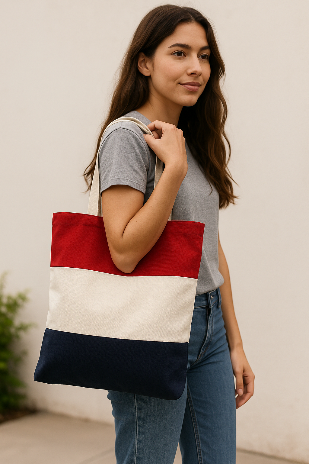 The Sundown Stripe Tote delivers everyday functionality with a bold, timeless palette. Made from durable eco-conscious canvas, its tri-color block design — deep red, natural cream, and classic navy — channels vintage style with modern versatility.